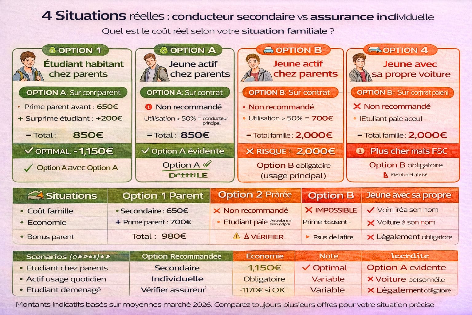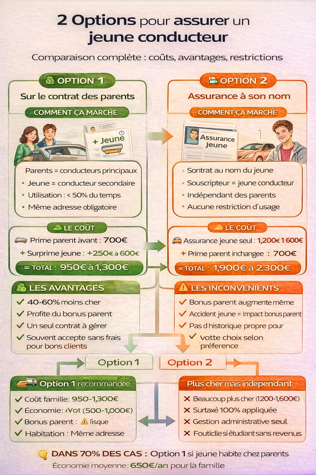 Le truc, c’est qu’il n’y a pas de réponse universelle. Ça dépend de votre situation, de l’utilisation de la voiture, de là où habite votre enfant, et de votre budget familial. À Marseille, des parents que je connais ont mis leur fils sur leur contrat et ont vu leur prime passer de 650€ à 980€, soit 330€ de plus. Mais si le fils s’était assuré seul, il aurait payé 1450€. Au final, ils ont économisé 470€ en le mettant sur leur contrat. Aujourd’hui, on va décortiquer les deux options pour que vous puissiez choisir en connaissance de cause.
