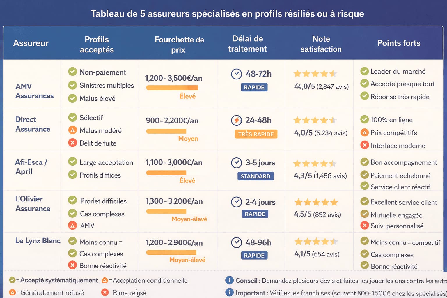 Les assureurs classiques (Macif, Maif, Matmut, etc.) ne voudront probablement pas de vous. Il faut vous tourner vers les spécialistes du risque aggravé.