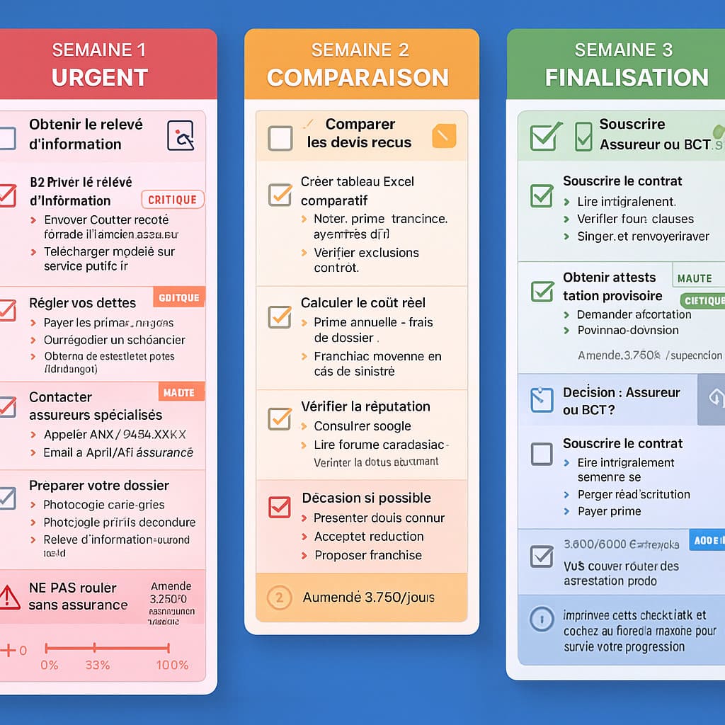 Être résilié par son assurance auto, c’est stressant, on ne va pas vous mentir. Mais ce n’est pas une condamnation à vie. En suivant ces 3 étapes méthodiquement – récupérer votre relevé d’information et régler vos dettes, comparer les assureurs spécialisés, et en dernier recours saisir le BCT – vous pouvez retrouver une assurance en 2 à 4 semaines maximum.