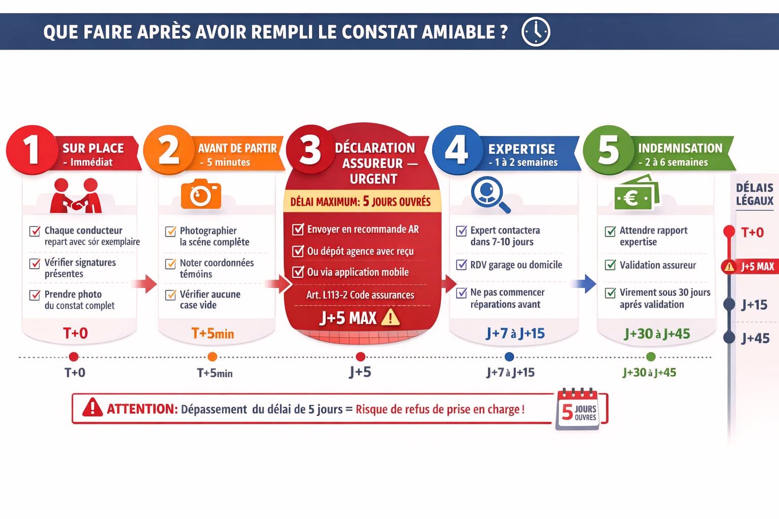 Une fois le constat rempli, vous avez 5 jours ouvrés maximum pour l’envoyer à votre assureur (article L113-2 du Code des assurances). Passé ce délai, votre assureur peut refuser de prendre en charge le sinistre ou réduire votre indemnisation.