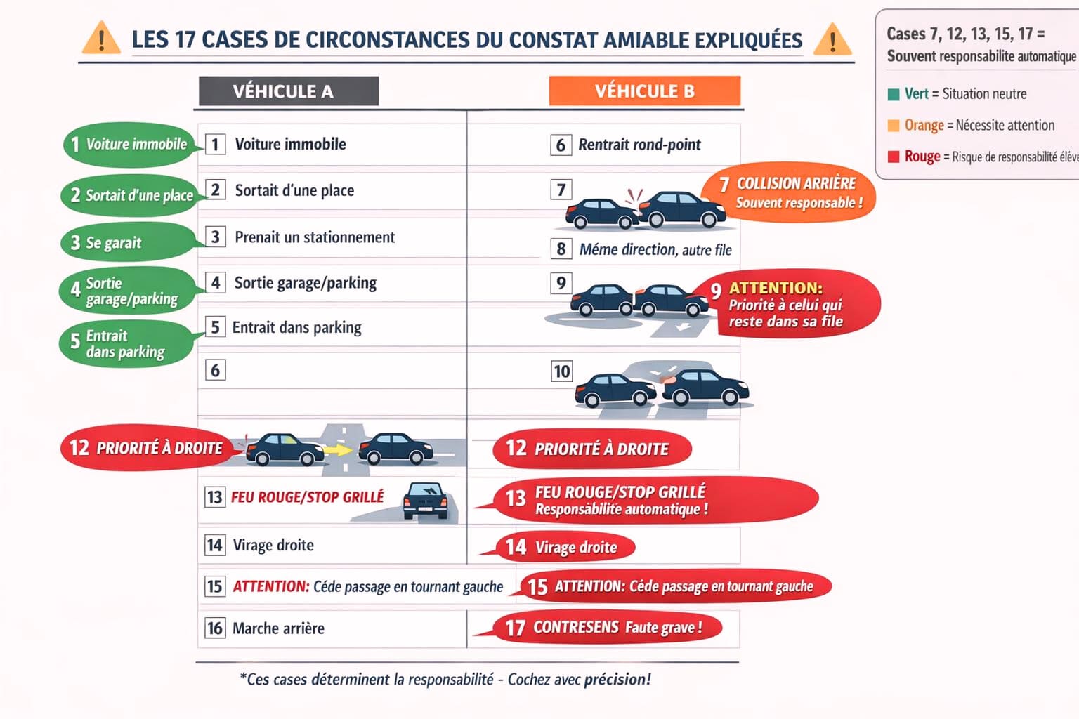 C’est là que ça devient technique. Sur le constat amiable, vous avez une grille de 17 cases de circonstances. Chaque conducteur coche les cases qui correspondent à sa situation. Ces cases déterminent directement qui est responsable.