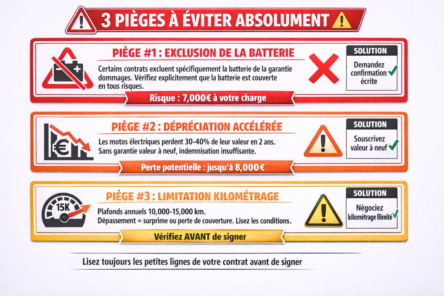Infographie d'avertissement présentant les 3 pièges principaux à éviter lors de la souscription d'une assurance moto électrique