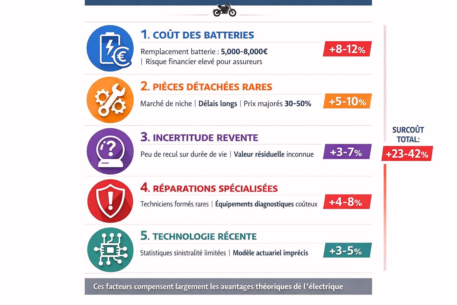 Infographie listant les 5 facteurs principaux qui augmentent le coût de l'assurance moto électrique malgré les avantages écologiques