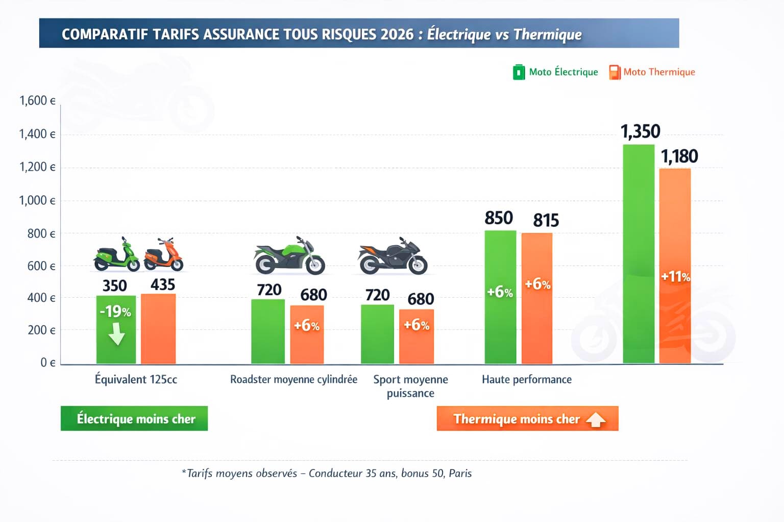 Graphique en barres comparant les tarifs d'assurance tous risques entre motos électriques et thermiques sur 4 catégories de puissance