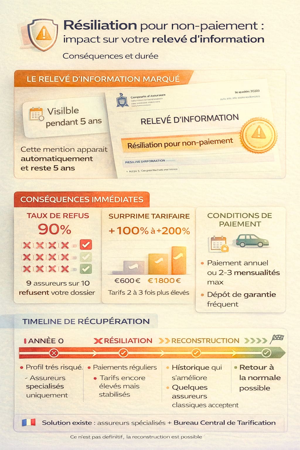 Quand votre assureur vous résilie pour non-paiement, cette information apparaît obligatoirement sur votre relevé d’information. C’est marqué noir sur blanc : « Résiliation pour non-paiement de prime », avec la date exacte. Impossible de l’effacer, impossible de la cacher, et tous les assureurs à qui vous demandez un devis vont le voir immédiatement.